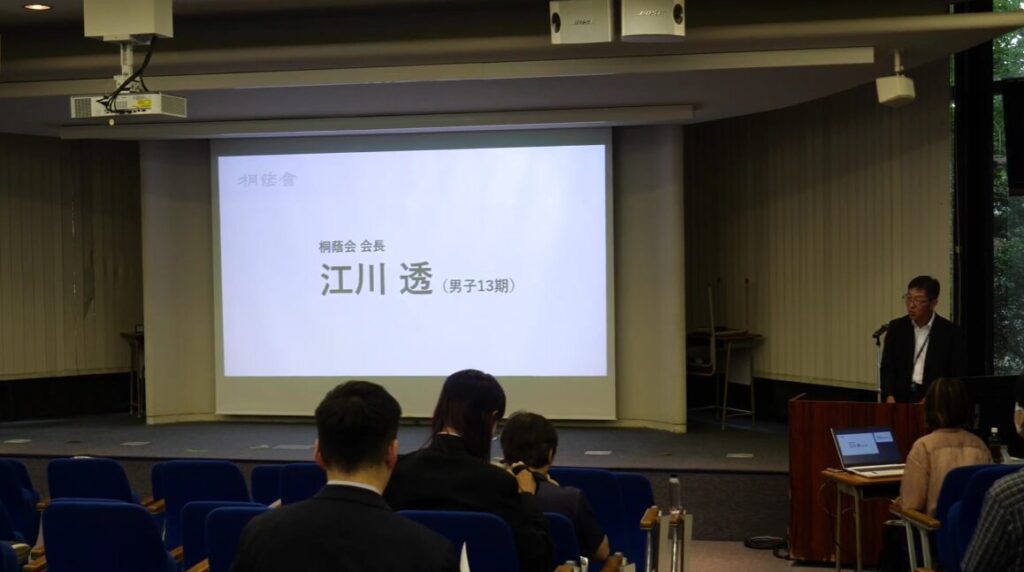桐蔭会 江川透会長より開会宣言、桐蔭学園 岡田直哉校長(桐蔭会名誉会長)よりビデオメッセージにてご挨拶をいただきました。